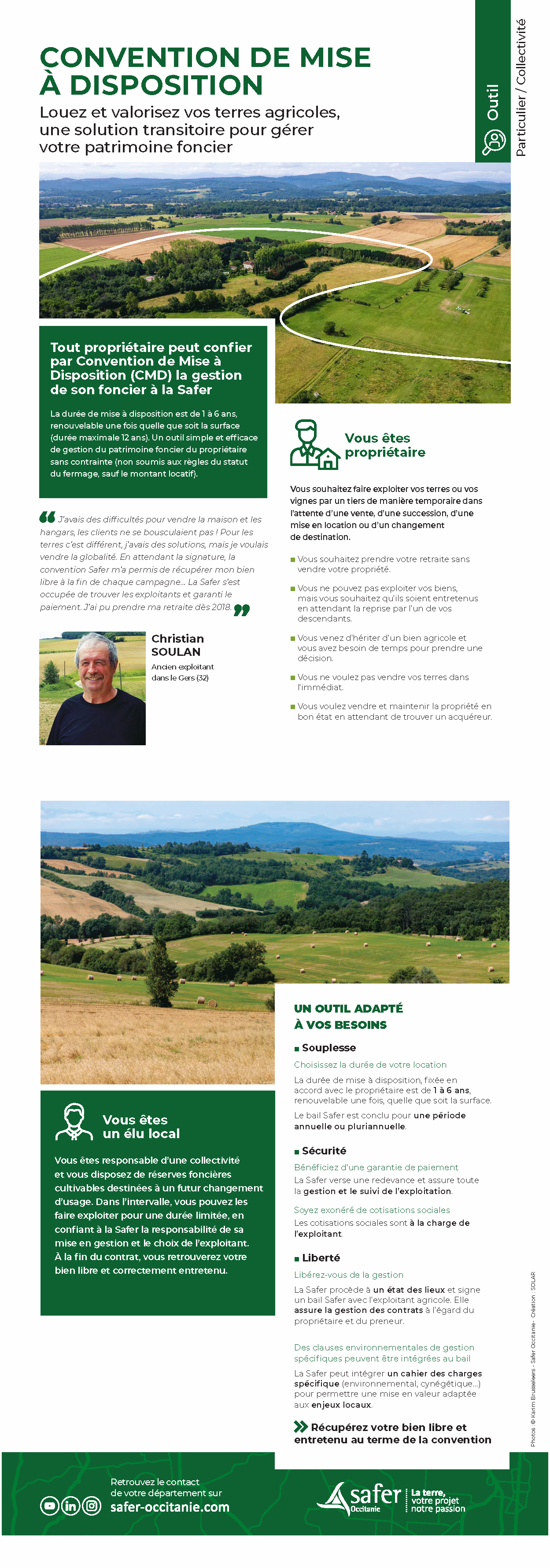 SEULE la SAFER peut vous le proposer via la Convention de Mise à Disposition (CMD), un outil simple et efficace de gestion de votre patrimoine foncier sans aucune contrainte.